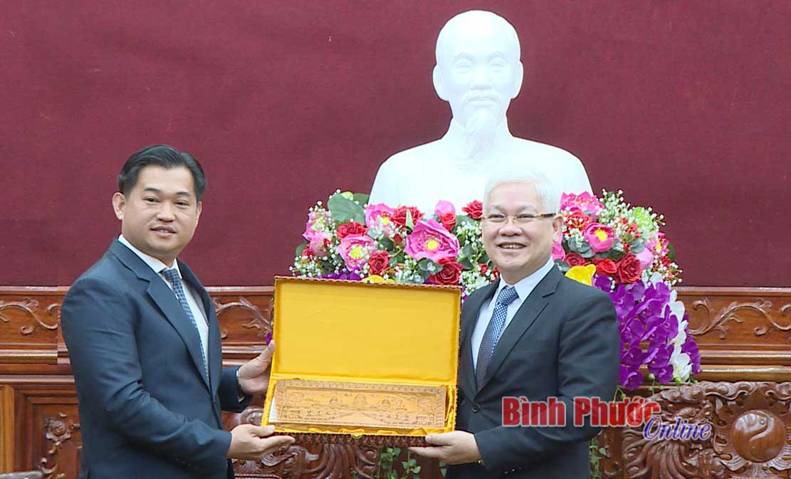 Tổng lãnh sự quán Vương quốc Campuchia tại TP. Hồ Chí Minh Sok Dareth tặng quà lưu niệm cho lãnh đạo tỉnh Bình Phước tại buổi tiếp và làm việcBí thư Tỉnh ủy Nguyễn Văn Lợi cũng cho biết, sẽ sớm trình và xin chủ trương của Chính phủ về việc xây dựng đặc khu kinh tế tại khu vực cửa khẩu quốc tế thuộc tỉnh Bình Phước. Ngoài chủ trương của Trung ương về xây dựng tuyến đường sắt từ TP. Hồ Chí Minh đi cửa khẩu quốc tế Hoa Lư, tỉnh Bình Phước cũng đang chuẩn bị các nguồn lực để đầu tư, nâng cấp, mở rộng quốc lộ 13, qua đó tăng cường giao thương hàng hóa giữa 2 nước, tạo động lực phát triển cho khu vực tam giác phát triển Campuchia - Lào - Việt Nam.