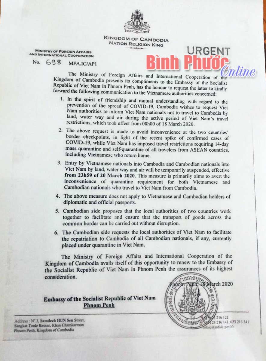 Công hàm nêu rõ: Trên tinh thần hữu nghị và hiểu biết lẫn nhau, liên quan tới việc phòng chống sự lây lan của dịch Covid-19, Campuchia đề nghị Việt Nam thông tin với các công dân Việt Nam không đến Campuchia bằng đường bộ, đường biển và đường hàng không. Việc xuất, nhập cảnh của 2 nước sẽ tạm ngừng kể từ 23 giờ 59 phút hôm nay 20-3.