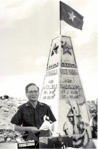 Trong chuyến ra thăm Trường Sa (tháng 5-1988), Đại tướng, Bộ trưởng Quốc phòng Lê Đức Anh phát biểu về chủ quyền thiêng liêng của quần đảo Trường Sa và trách nhiệm, sứ mệnh của bộ đội Trường Sa trong việc bảo vệ chủ quyền của Tổ quốc nơi đầu sóng ngọn gió. Bài phát biểu ấy được coi như “Tuyên ngôn về Trường Sa” có sức mạnh đặc biệt đối với sự nghiệp bảo vệ chủ quyền biển đảo và toàn vẹn lãnh thổ của Tổ quốc trong thời kỳ mới. (Ảnh: TTXVN)