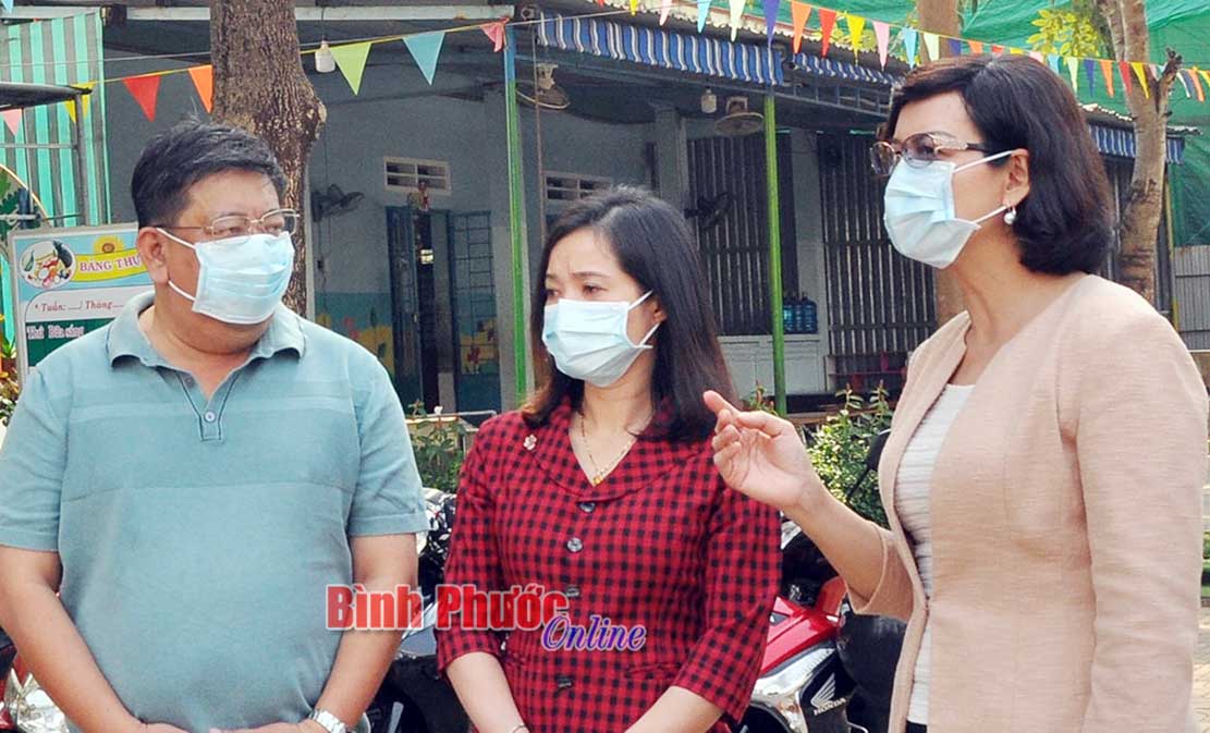 Phó chủ tịch UBND tỉnh Trần Tuyết Minh (bìa phải) kiểm tra công tác phòng, chống dịch Covid-19 tại Trường mầm non Hoa Cúc (Đồng Xoài) ngày 6-2-2020 - Ảnh: Hồng Cúc
