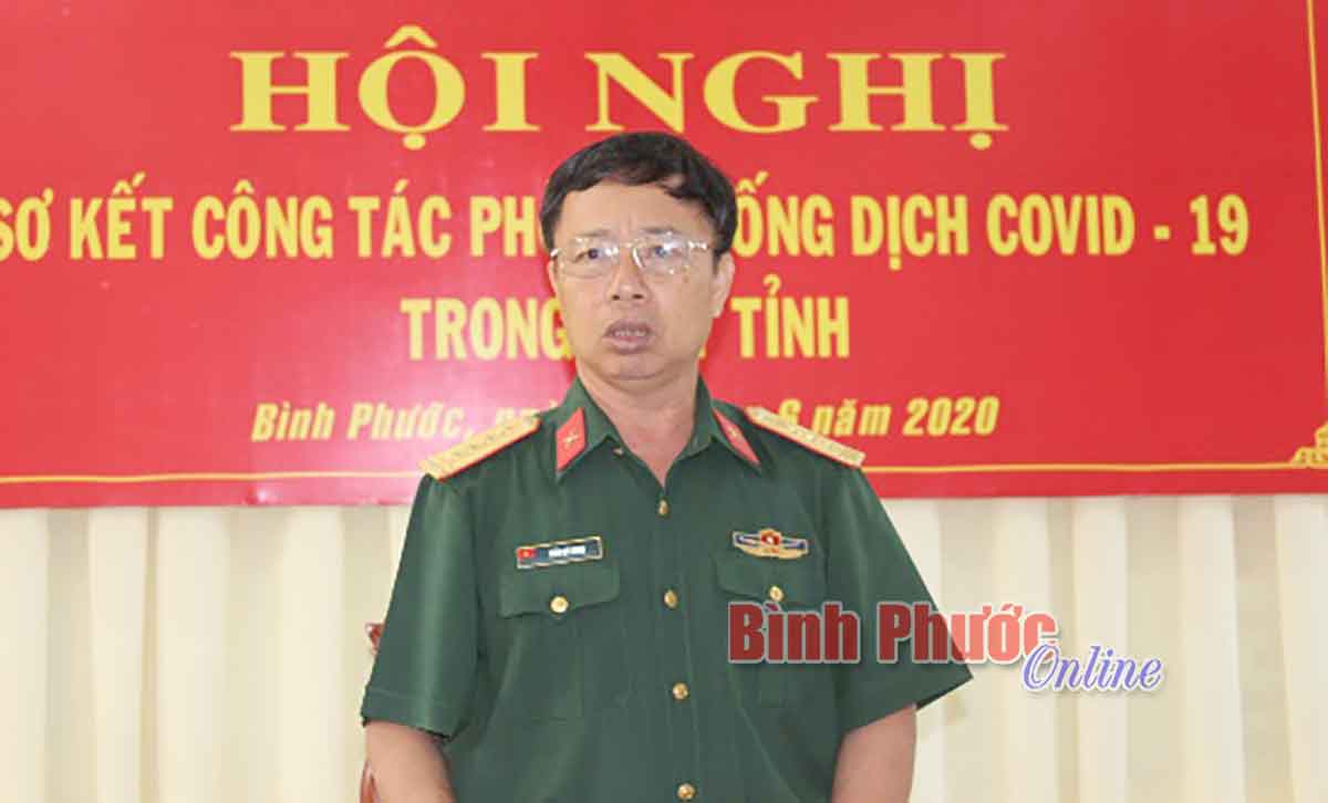 Đại tá Trần Bá Chung phát biểu chỉ đạo tại hội nghị sơ kết công tác phòng, chống dịch Covid-19Phát biểu tại hội nghị, Đại tá Trần Bá Chung, Trưởng ban Chỉ đạo phòng, chống dịch Covid-19 Bộ CHQS tỉnh biểu dương các cơ quan, đơn vị đã tích cực, chủ động và trách nhiệm cao trong công tác phòng, chống dịch; ghi nhận sự phối hợp, hiệp đồng chặt chẽ của cấp ủy, chính quyền địa phương trong vận hành cơ chế lãnh đạo, chỉ đạo các lực lượng phòng, chống dịch theo phương châm “4 tại chỗ”.