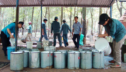 Toàn tỉnh cần ra sức phấn đấu để lập thành tích chào mừng kỷ niệm 15 năm tái lấp tỉnh. Ảnh: Giờ giao nộp mủ ở tổ 4, Nông trường Minh Hưng, Công ty TNHH MTV Cao su Pú Riềng - Hải Châu