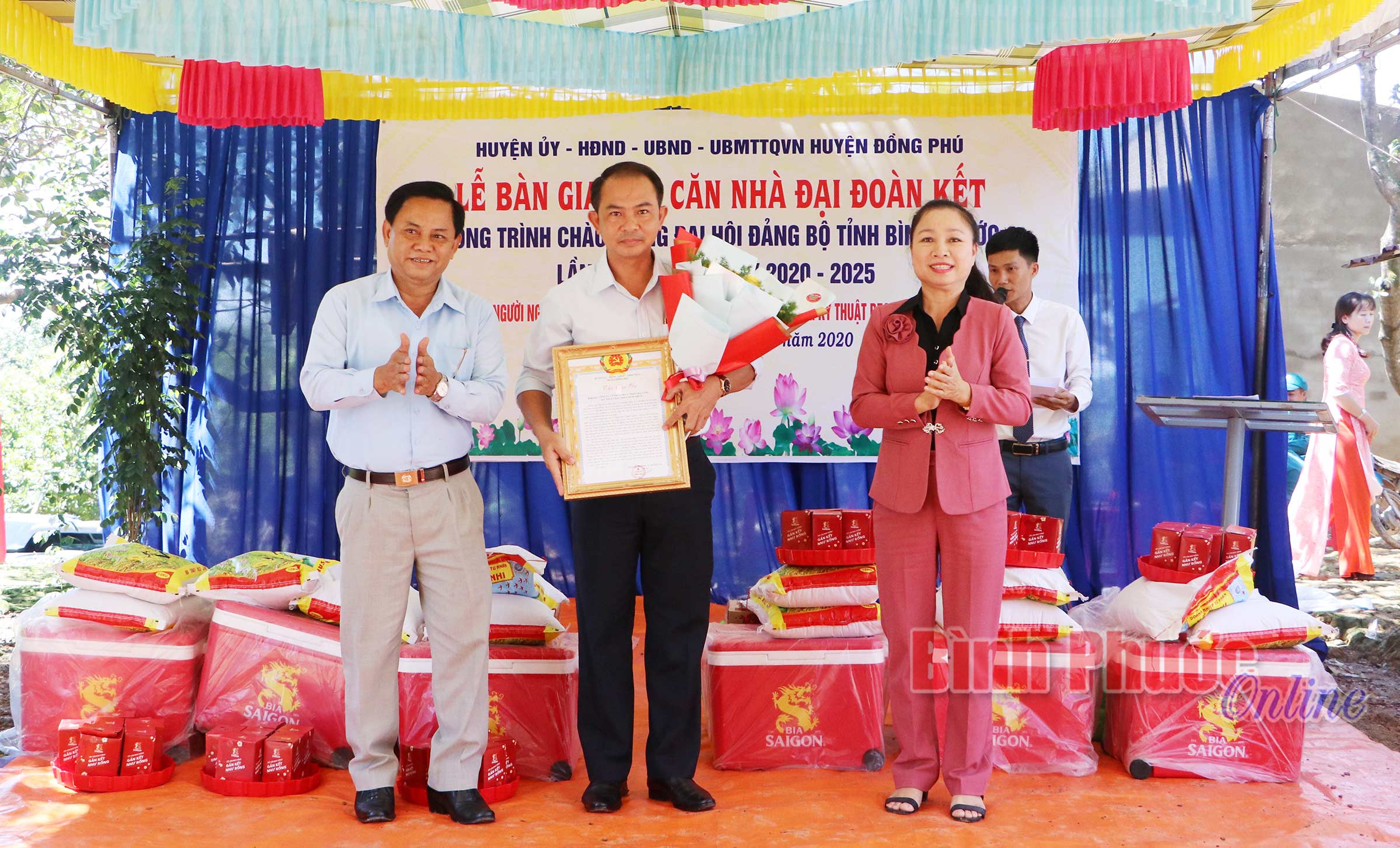 Ủy viên Ban Thường vụ, Trưởng Ban Dân vận Tỉnh ủy, Chủ tịch Ủy ban MTTQ Việt Nam tỉnh Lê Thị Xuân Trang và Bí thư Huyện ủy Đồng Phú Trần Văn Vinh trao thư cảm ơn và hoa cho ông Nguyễn Thanh Nhã, Tổng giám đốc Công ty cổ phần Phát triển hạ tầng kỹ thuật Becamex-Bình Phước