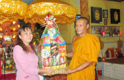Bà Trần Bích Lệ, Phó chủ tịch UBND huyện Lộc Ninh tặng quà cho chùa Sóc Lớn