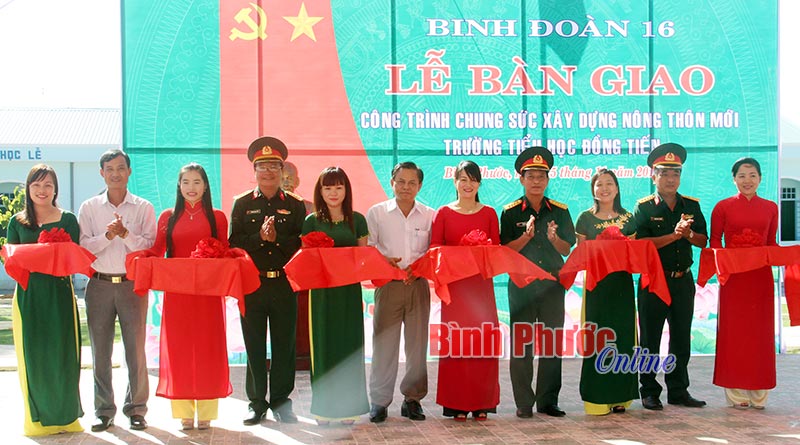Hằng năm, Binh đoàn 16 trích hàng chục tỷ đồng xây dựng cơ sở hạ tầng phục vụ dân sinh, nhất là xây dựng các công trình nông thôn mới. Vừa qua, binh đoàn hỗ trợ tỉnh Bình Phước 10 tỷ đồng xây dựng nhà tưởng niệm tại Di tích căn cứ Tà Thiết (Lộc Ninh). Trong ảnh: Binh đoàn 16 tổ chức lễ bàn giao công trình nông thôn mới cho Trường tiểu học Đồng Tiến A (Đồng Phú).