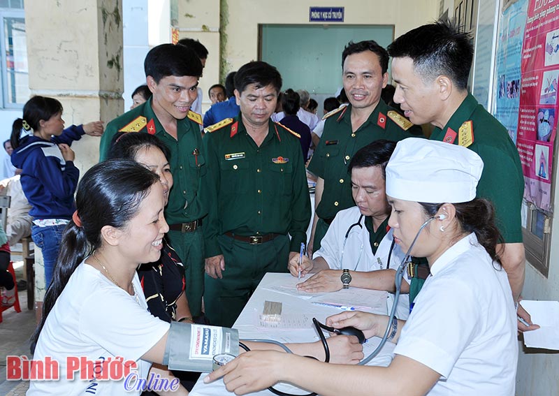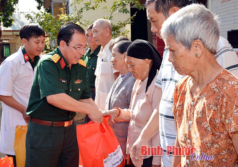 Mỗi năm Binh đoàn 16 tổ chức khám, phát thuốc miễn phí khoảng 1.500 lượt người nghèo, gia đình chính sách với tổng trên 300 triệu đồng/năm. Trong ảnh: Đội ngũ y, bác sĩ Bệnh viện quân dân y 16 khám bệnh, cấp thuốc cho 600 người nghèo, khó khăn tại huyện Bù Đốp ngày 17-5-2017.