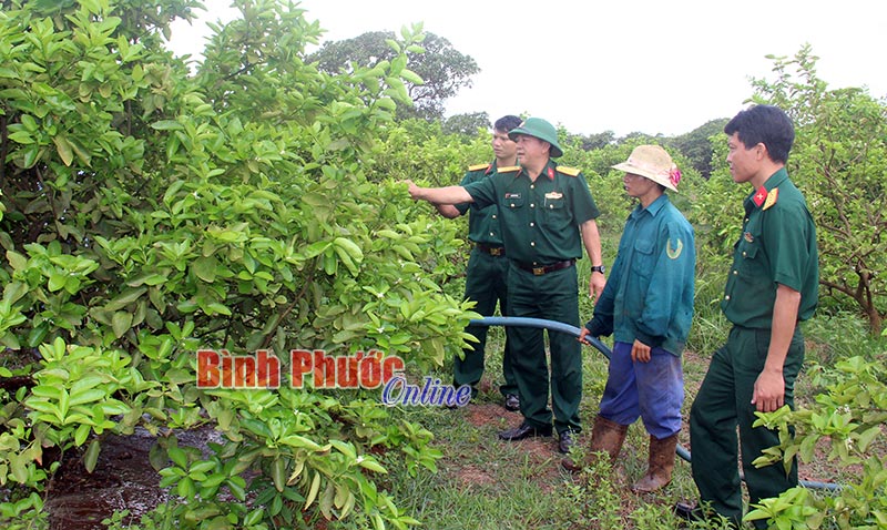 Cán bộ, chiến sĩ Trung đoàn 719 hướng dẫn kỹ thuật trồng, chăm sóc nhằm nâng cao năng suất vườn cây cho các hộ nhận khoán.