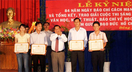 Bí thư Tỉnh ủy Nguyễn Tấn Hưng tặng giấy khen cho các phóng viên Đài PT-TH Bình Phước đoạt giải tại cuộc thi viết về tấm gương đạo đức Hồ Chí Minh - Ảnh: H.T