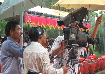 Phóng viên Đài PT-TH Bình Phước tác nghiệp trong mưa - Ảnh: H.T