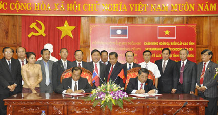 Chủ tịch UBND tỉnh Trương Tấn Thiệu và Bí thư tỉnh ủy, Tỉnh trưởng Suphan Keosisay ký biên bản hội đàm