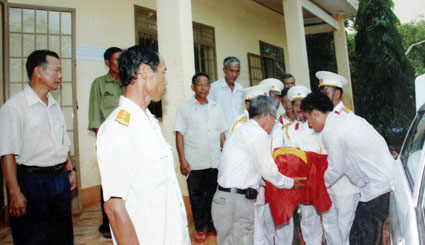 Đội đưa hài cốt liệt sĩ về trụ sở UBND xã để làm lễ truy điệu