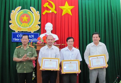 Phó giám đốc Công an tỉnh Huỳnh Văn Sách tặng giấy khen cho các tập thể, cá nhân làm tốt công tác tuyên truyền
