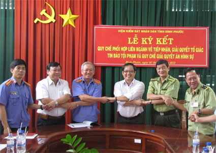 Ngày 5-4, Công an, viện Kiểm sát, cục Thuế, cục Hải quan, chi cục Quản lý thị trường, chi cục Kiểm lâm, Bộ chỉ huy biên phòng tỉnh đã ký kết quy chế phối hợp về tiếp nhận, giải quyết tin báo tố giác tội phạm; Công an tỉnh, viện Kiểm sát và Tòa án nhân dân tỉnh ký kết quy chế phối hợp về giải quyết án hình sự.