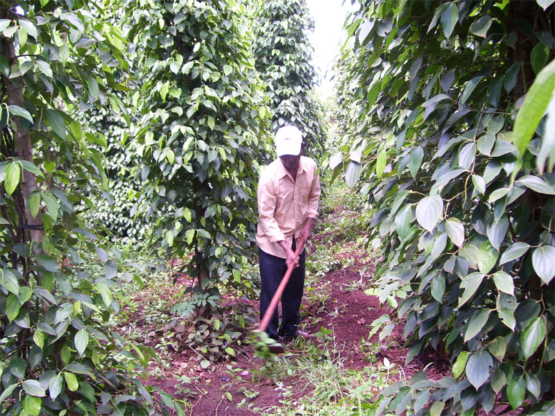 Nông dân Lộc Ninh chăm sóc hồ tiêu chuẩn bị mùa vụ mới