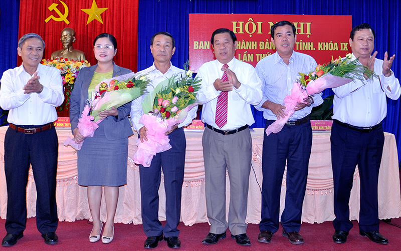 Bí thư tỉnh ủy Nguyễn Tấn Hưng, Phó bí thư thường trực tỉnh ủy Võ Đình Tuyến, Phó bí thư tỉnh ủy, Chủ tịch UBND tỉnh Nguyễn Văn Trăm tặng hoa và chúc mừng 3 đồng chí được bầu bổ sung vào Ban thường vụ tỉnh ủy