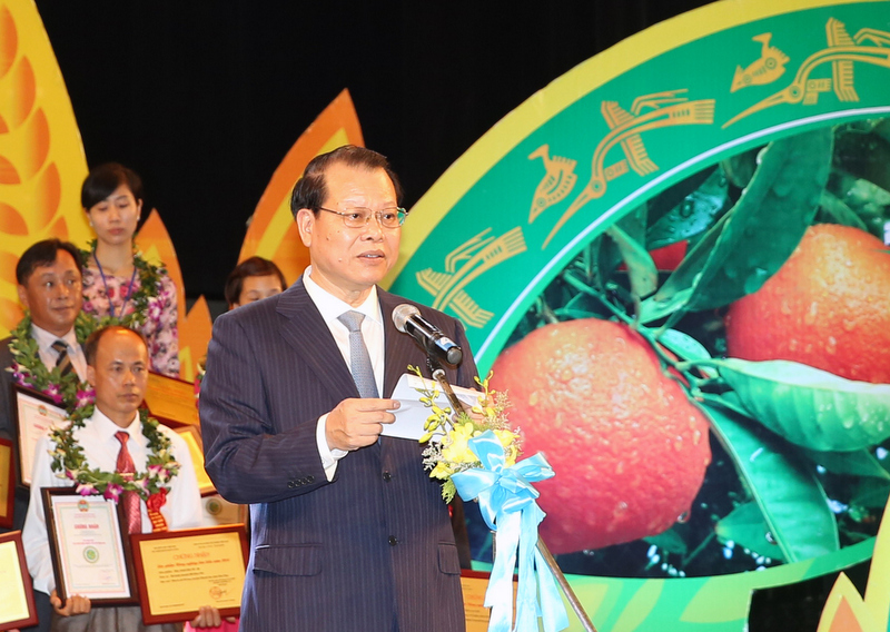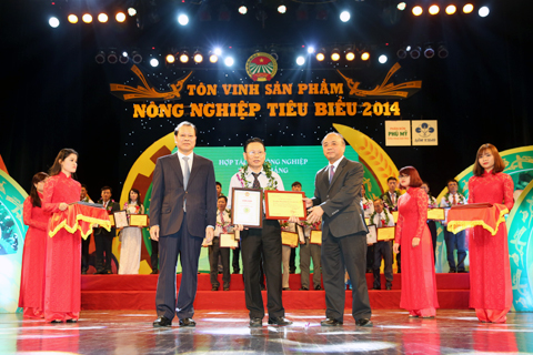 Phó Thủ tướng Vũ Văn Ninh cùng Chủ tịch Hội nông dân Việt Nam Nguyễn Quốc Cường trao chứng nhận sản phẩm nông nghiệp Việt Nam tiêu biểu năm 2014 cho các đơn vị