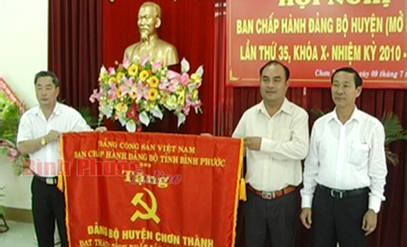 Chủ nhiệm Ủy ban Kiểm tra Tỉnh ủy Nguyễn Văn Dũng trao cờ của Ban Chấp hành Đảng bộ tỉnh cho Đảng bộ huyện Chơn Thành đạt thành tích xuất sắc trong nhiệm kỳ 2010-2015