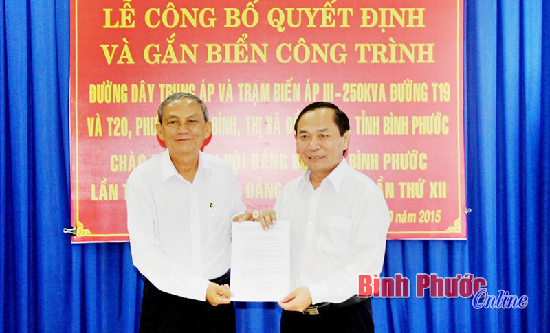 Ông Lâm Văn Phúc (trái), Chủ tịch Liên đoàn lao động tỉnh trao quyết định gắn bảng công trình đường dây trung áp, hạ áp và trạm biến áp II -250KVA cho ông Đỗ Văn Hờn, Phó giám đốc Công ty điện lực Bình Phước