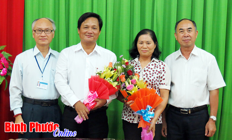 Bà Nguyễn Thị Tâm và ông Võ Sá nhận hoa chúc mừng đã hoàn thành tốt nhiệm vụ tại HĐND tỉnh