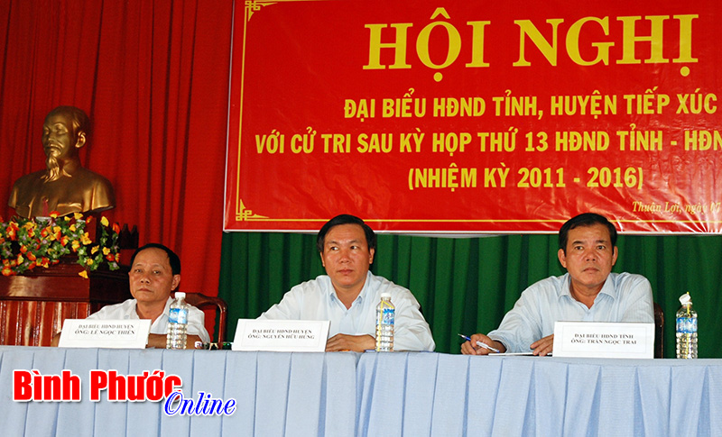 Trong buổi tiếp xúc, cử tri xã Thuận Lợi có 7 lượt ý kiến, kiến nghị giải quyết các vấn đề: Một số vấn đề phát sinh xung quanh xây dựng hồ chứa nước Đồng Xoài. Kéo dài thời gian làm một số tuyến đường giao thông ở ấp Thuận Tiến. Biện pháp xử lý ô nhiễm môi trường, an toàn giao thông. Bảo đảm quyền lợi của người tham gia bảo hiểm y tế, giải thích rõ ràng về việc mua bảo hiểm xã hội tự nguyện đối với hộ gia đình. Đường điện ở tổ 6, ấp Thuận Tiến. Cấp đổi giấy chứng nhận quyền sử dụng đất. Kiến nghị lên Quốc hội để có biện pháp điều chỉnh giá mủ cao su...