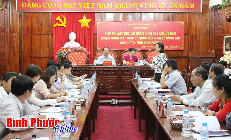 Báo cáo với đoàn giám sát, ông Nguyễn Thành Chương, Giám đốc Sở Nội vụ, cơ quan thường trực Ủy ban bầu cử tỉnh cho biết: Đến nay, Bình Phước có 684.161 cử tri. Cấp tỉnh, huyện, xã đã thành lập 123 ủy ban và ban bầu cử. Tỉnh ủy và các huyện, thị ủy đã thành lập ban chỉ đạo bầu cử để chỉ đạo tốt cuộc bầu cử đại biểu Quốc hội khóa XIV và HĐND các cấp nhiệm kỳ 2016-2021. Số đơn vị bầu cử đại biểu HĐND huyện, thị xã là 100. Số đơn vị bầu cử đại biểu HĐND xã, phường, thị trấn là 822.