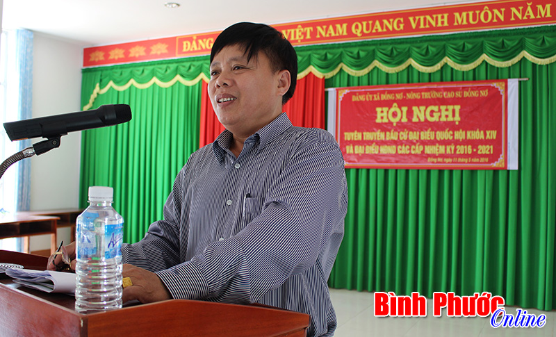 Tại buổi tuyên truyền, ông Trần Văn Thịnh, Ủy viên Ban thường vụ, Trưởng ban Tuyên giáo Huyện ủy Hớn Quản đã trình bày những nội dung quan trọng liên quan đến cuộc bầu cử đại biểu Quốc hội khóa XIV và HĐND các cấp nhiệm kỳ 2016-2021; cung cấp lý lịch trích ngang của các ứng cử viên đại biểu Quốc hội khóa XIV, đại biểu HĐND tỉnh và HĐND huyện Hớn Quản nhiệm kỳ 2016-2021 (đã được niêm yết công khai tại trụ sở xã Đồng Nơ).