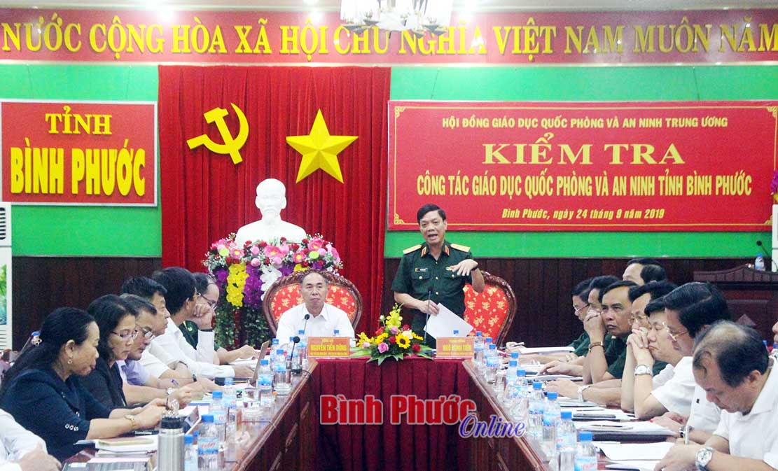 BP - Ngày 24-9, đoàn kiểm tra của Hội đồng Giáo dục quốc phòng - an ninh (QP-AN) Trung ương do Trung tướng Ngô Minh Tiến, Phó tổng Tham mưu trưởng Quân đội nhân dân Việt Nam, Phó trưởng Ban Thường trực Hội đồng Giáo dục QP-AN Trung ương làm trưởng đoàn có buổi làm việc với tỉnh Bình Phước về kết quả thực hiện công tác giáo dục QP-AN trên địa bàn tỉnh năm 2018 và 9 tháng năm 2019. Phó chủ tịch UBND tỉnh, Chủ tịch Hội đồng Giáo dục QP-AN tỉnh Nguyễn Tiến Dũng cùng đại diện lãnh đạo các sở, ban, ngành của tỉnh, UBND các huyện, thị xã, thành phố tiếp và làm việc với đoàn.