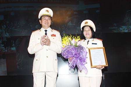Bộ trưởng Trần Đại Quang trao quyết định thăng cấp bậc hàm Thiếu tướng cho Giám đốc Công an tỉnh Kiên Giang, bà Bùi Tuyết Minh. Ảnh: cand.vn |