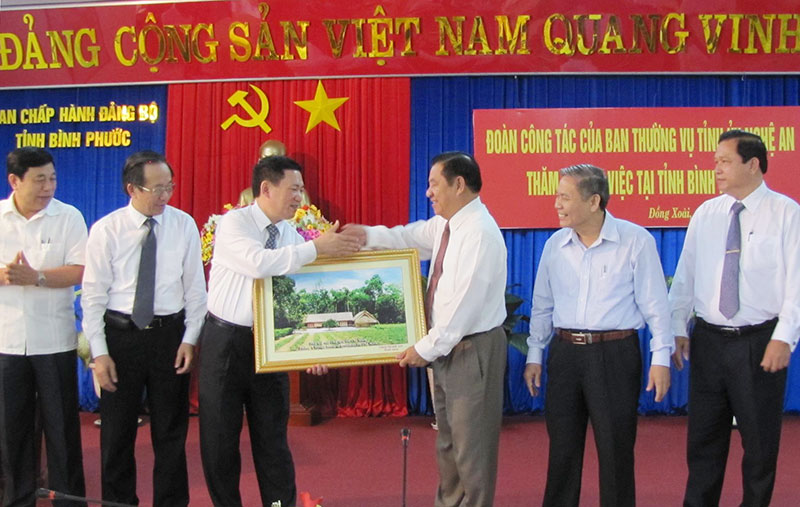 Đồng chí Hồ Đức Phớc trao quà lưu niệm của Ban Thường vụ Tỉnh ủy Nghệ An cho Ban Thường vụ Tỉnh ủy Bình Phước