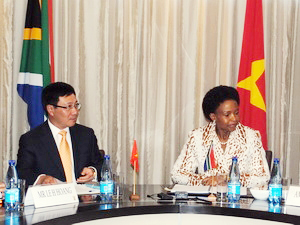 Nhận lời mời của Bộ trưởng Hợp tác và Quan hệ Quốc tế Nam Phi Maite Nkoana-Mashabane, Bộ trưởng Ngoại giao Phạm Bình Minh đã có chuyến thăm chính thức Cộng hòa Nam Phi trong hai ngày 5 và 6-8.