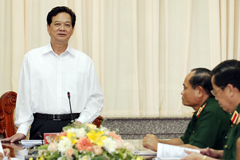 | Thủ tướngNguyễn Tấn Dũng phát biểu tại buổi làm việc với Đảng ủy Quân khu 9 và lãnh đạo các tỉnh, thành liên quan về tình hình thực hiện nhiệm vụ quốc phòng-an ninh, ngày 23-8 |