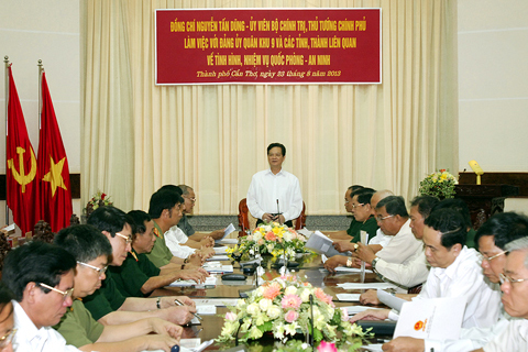 Chiều 23-8, tại trụ sở Bộ Tư lệnh Quân khu 9 (TP. Cần Thơ), Thủ tướng Nguyễn Tấn Dũng đã có buổi làm việc với Đảng ủy Quân khu 9 và lãnh đạo các tỉnh, thành phố liên quan về tình hình thực hiện nhiệm vụ quốc phòng-an ninh.