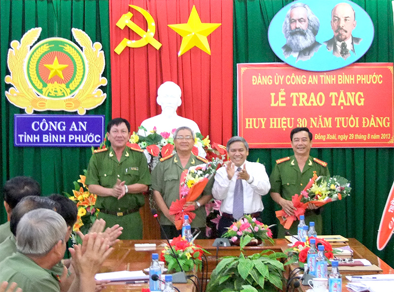 Tại buổi lễ, Phó bí thư thường trực tỉnh ủy Võ Đình Tuyến đã chúc mừng hai đồng chí được nhận huy hiệu 30 năm tuổi Đảng dịp Quốc khánh 2-9 năm nay và mong rằng trong thời gian tới hai đồng chí sẽ có nhiều đóng góp hơn nữa vào nhiệm vụ bảo vệ ANTT, góp phần xây dựng tỉnh Bình Phước ngày càng giàu, mạnh.