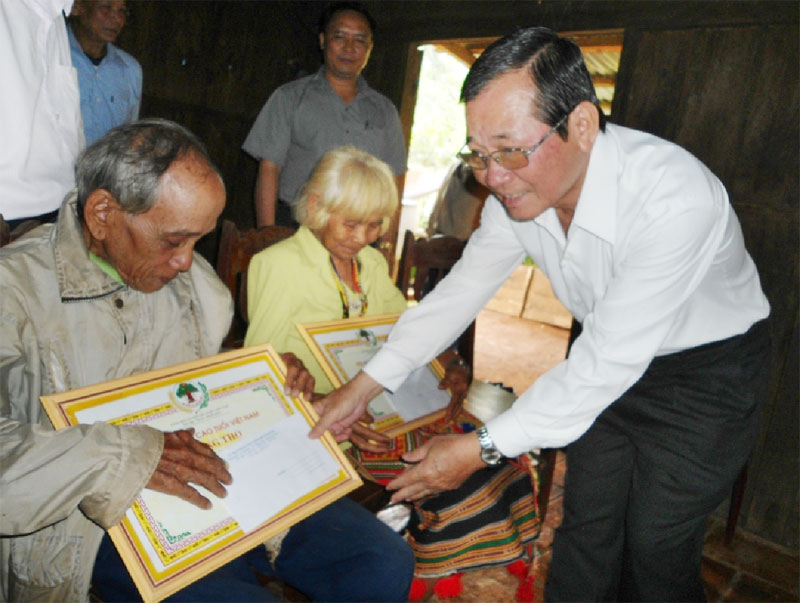 Phó chủ tịch Phạm Văn Tòng cùng đoàn đại biểu tới thăm, chúc thọ và tặng quà cho vợ chồng cụ Thị Cheng và Điểu Kéh ở xã Phú Sơn