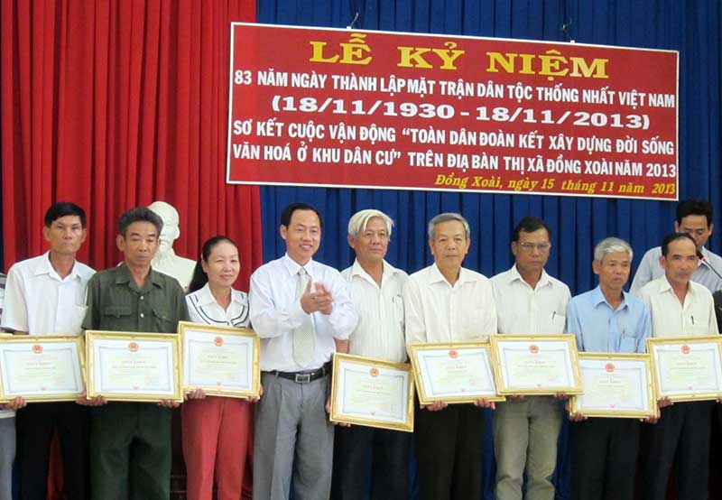 * Ủy ban MTTQ Việt Nam thị xã Đồng Xoài vừa tổ chức kỷ niệm 83 năm ngày thành lập Mặt trận dân tộc thống nhất Việt Nam (18-11-1930 - 18-11-2013) và sơ kết phong trào “Toàn dân đoàn kết xây dựng đời sống văn hóa” năm 2013.