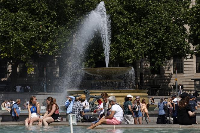 Người dân tránh nóng bên đài phun nước tại Quảng trường Trafalgar ở thủ đô London, Anh, ngày 17-6-2022. Ảnh: AFP/ TTXVN