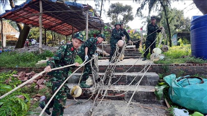 Lực lượng Biên phòng Cô Tô (Quảng Ninh) giúp người dân chằng chống tàu thuyền tại nơi neo đậu an toàn. Ảnh: TTXVN phát
