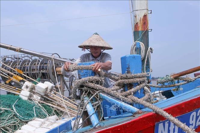 Ngư dân chằng buộc tàu thuyền trước khi bão số 3 đổ bộ đất liền. Ảnh: Công Luật/TTXVN