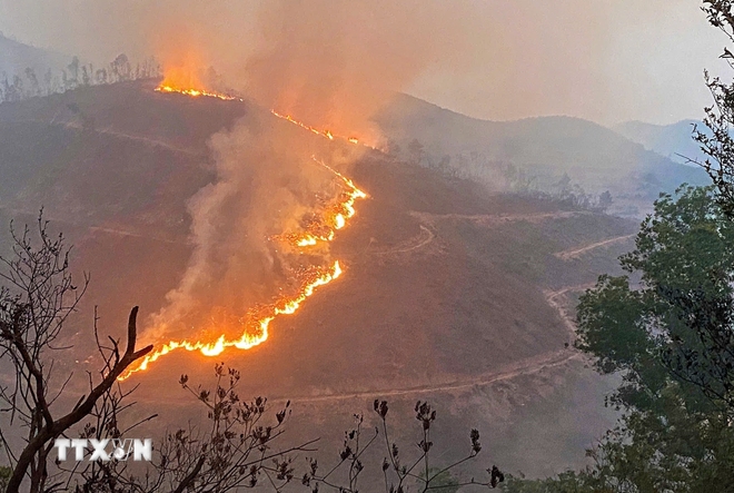 Đám cháy rừng từ chiều 20-3-2025, trên địa bàn tổ dân phố Minh Phượng, phường Nham Biền, thành phố Bắc Giang. (Ảnh: TTXVN phát)