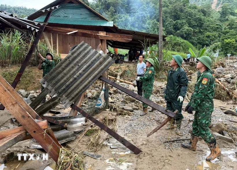 Cán bộ, chiến sỹ Đồn biên phòng Tri Lễ huy động hỗ trợ người dân khắc phục hậu quả mưa lũ trên địa bàn tỉnh Nghệ An. (Ảnh: TTXVN phát)