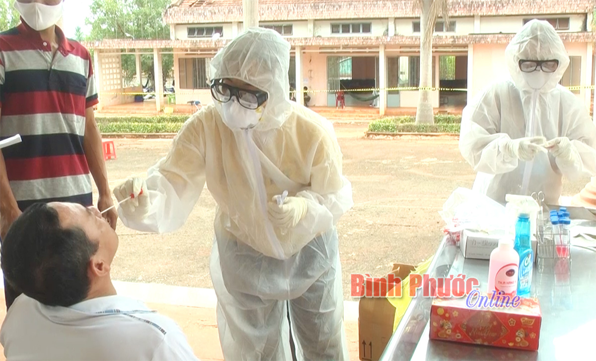 Cán bộ y tế lấy mẫu xét nghiệm virus SARS-CoV-2 tại khu cách ly tập trung huyện Lộc Ninh