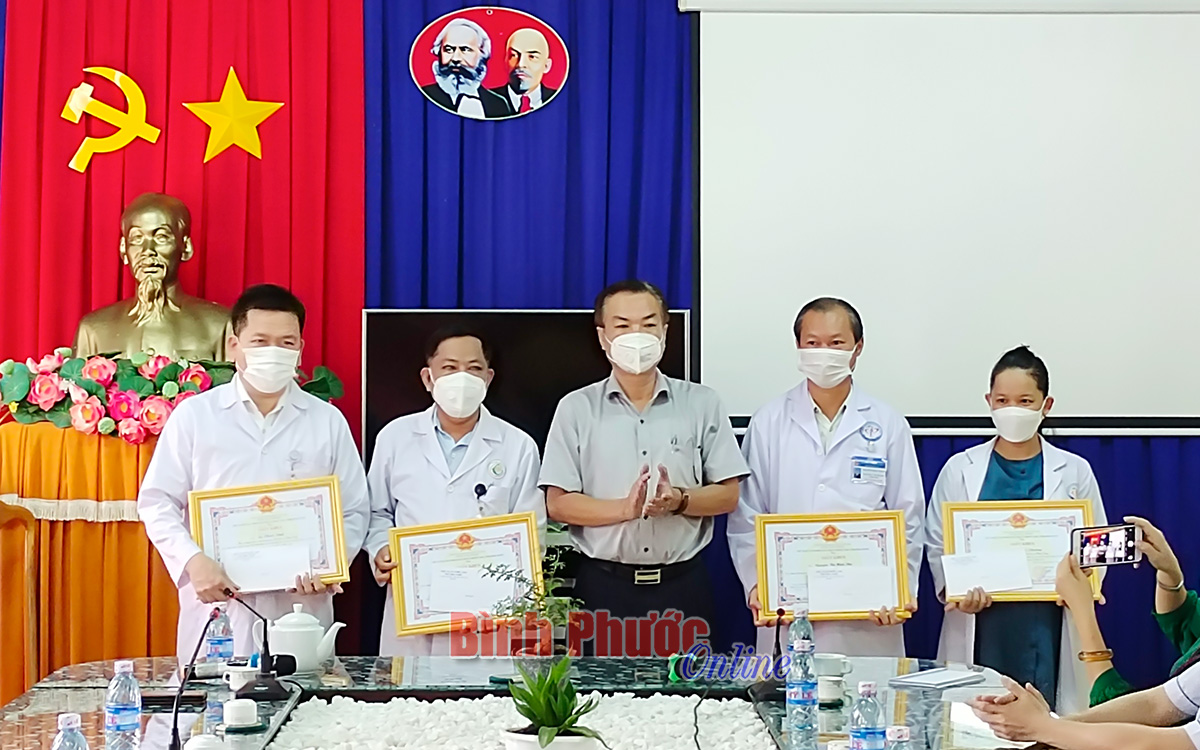 Thừa ủy quyền của UBND thị xã Phước Long, Giám đốc Trung tâm Y tế thị xã Lê Thanh Long trao giấy khen cho các y, bác sĩ trong ê kíp