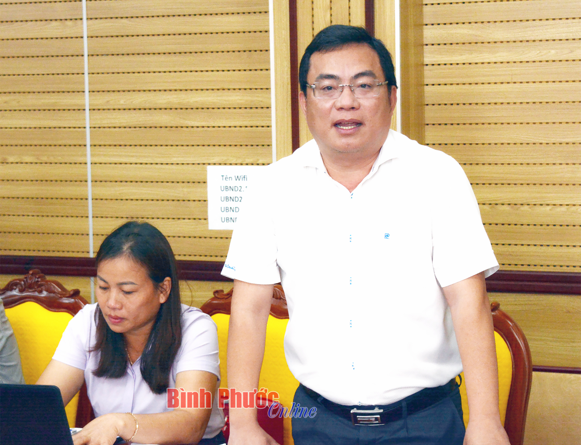Phó chủ tịch UBND thị xã Phước Long Nguyễn Văn Dũng báo cáo công tác huy động, quản lý, sử dụng các nguồn kinh phí phục vụ công tác phòng, chống dịch Covid-19 năm 2021 trên địa bàn
