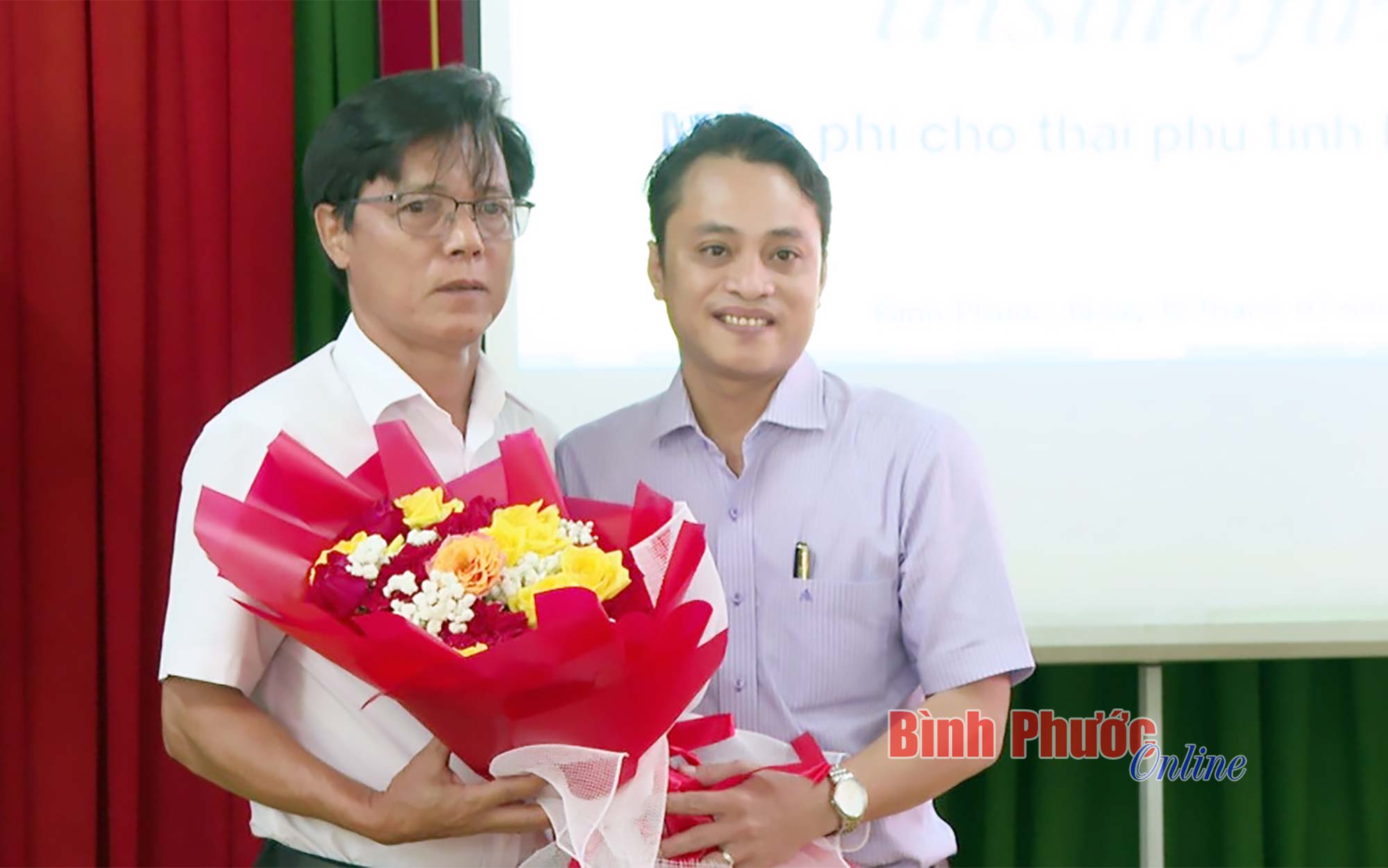 Chi cục trưởng Chi cục DS-KHHGĐ tỉnh, bác sỹ Bạch Sỹ Long nhận hoa và 55 mẫu xét nghiệm NIPT - triSureFirst miễn phí từ Viện Di truyền y học và Công ty TNHH Gene Solutions Lab