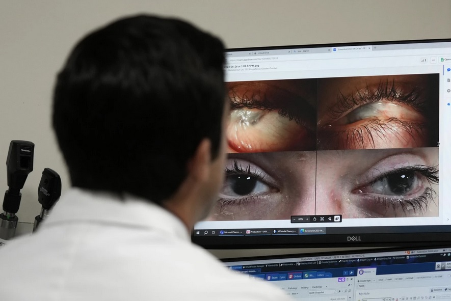 Bác sĩ Alfonso Sabater bên máy tính có hình ảnh về đôi mắt của Antonio trước và sau khi phẫu thuật, sử dụng thuốc nhỏ mắt liệu pháp gene. Ảnh: AP