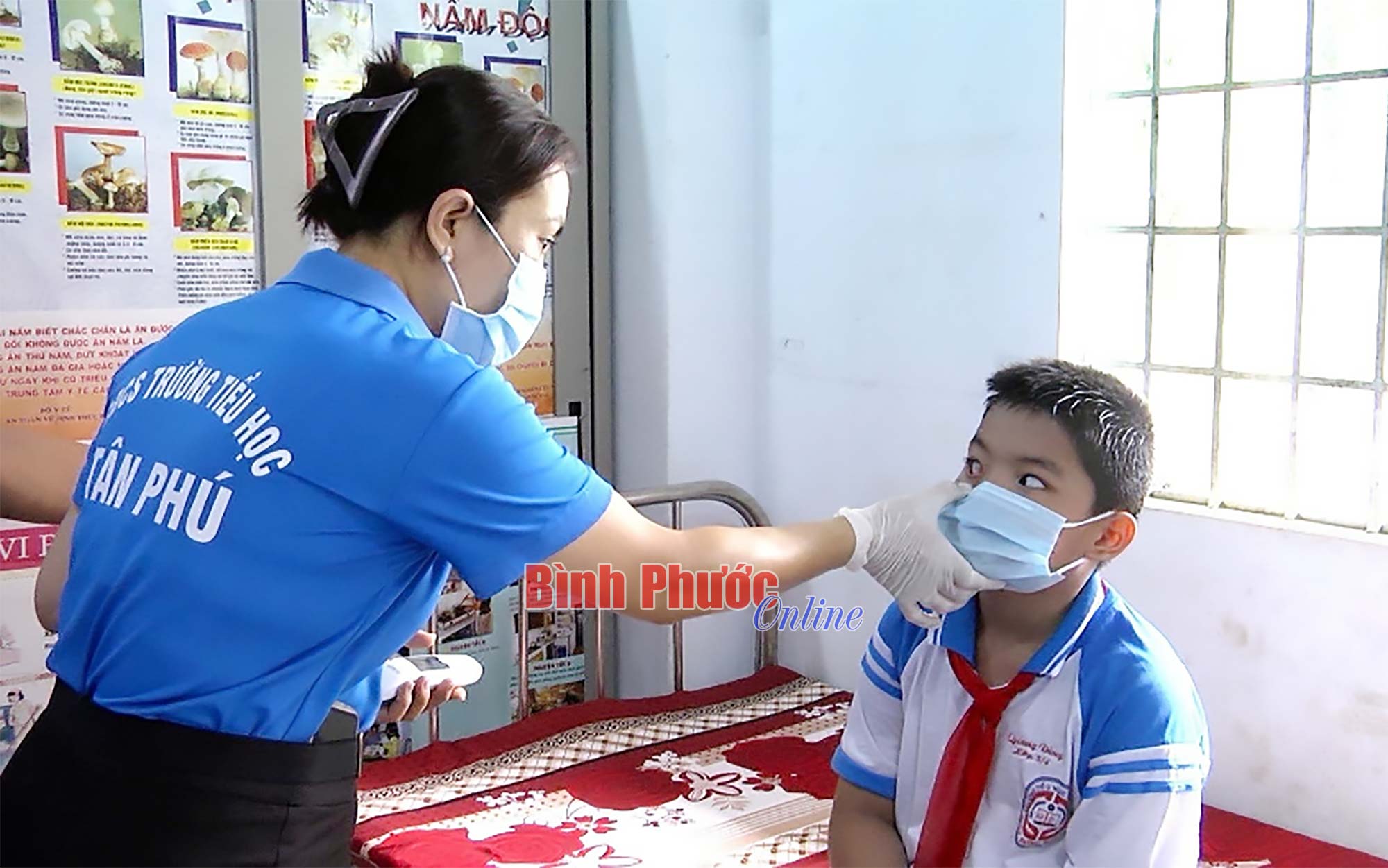 Các y, bác sĩ Khoa Kiểm soát bệnh tật - HIV/AIDS, Trung tâm Y tế thành phố Đồng Xoài kiểm tra xác minh bệnh đau mắt đỏ tại Trường Tiểu học Tân Phú