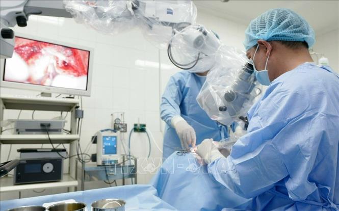 Bác sĩ Bệnh viện Tai mũi họng Thành phố Hồ Chí Minh phẫu thuật cấy ốc tai điện tử cho người bệnh. Ảnh: TTXVN phát