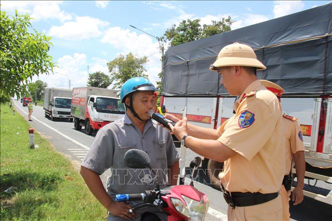 Kiểm tra nồng độ cồn của người tham gia giao thông. Ảnh: TTXVN