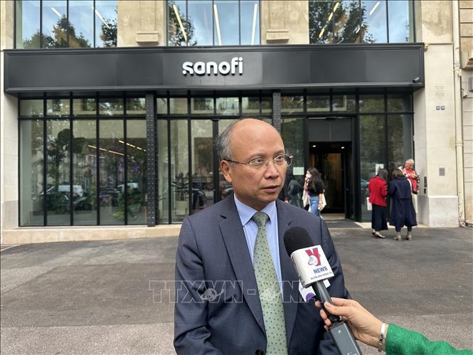 Đại sứ Việt Nam tại Pháp Đinh Toàn Thắng chia sẻ với phóng viên TTXVN sau khi chứng kiến lễ ký kết biên bản hợp tác giữa VNVC và Sanofi.