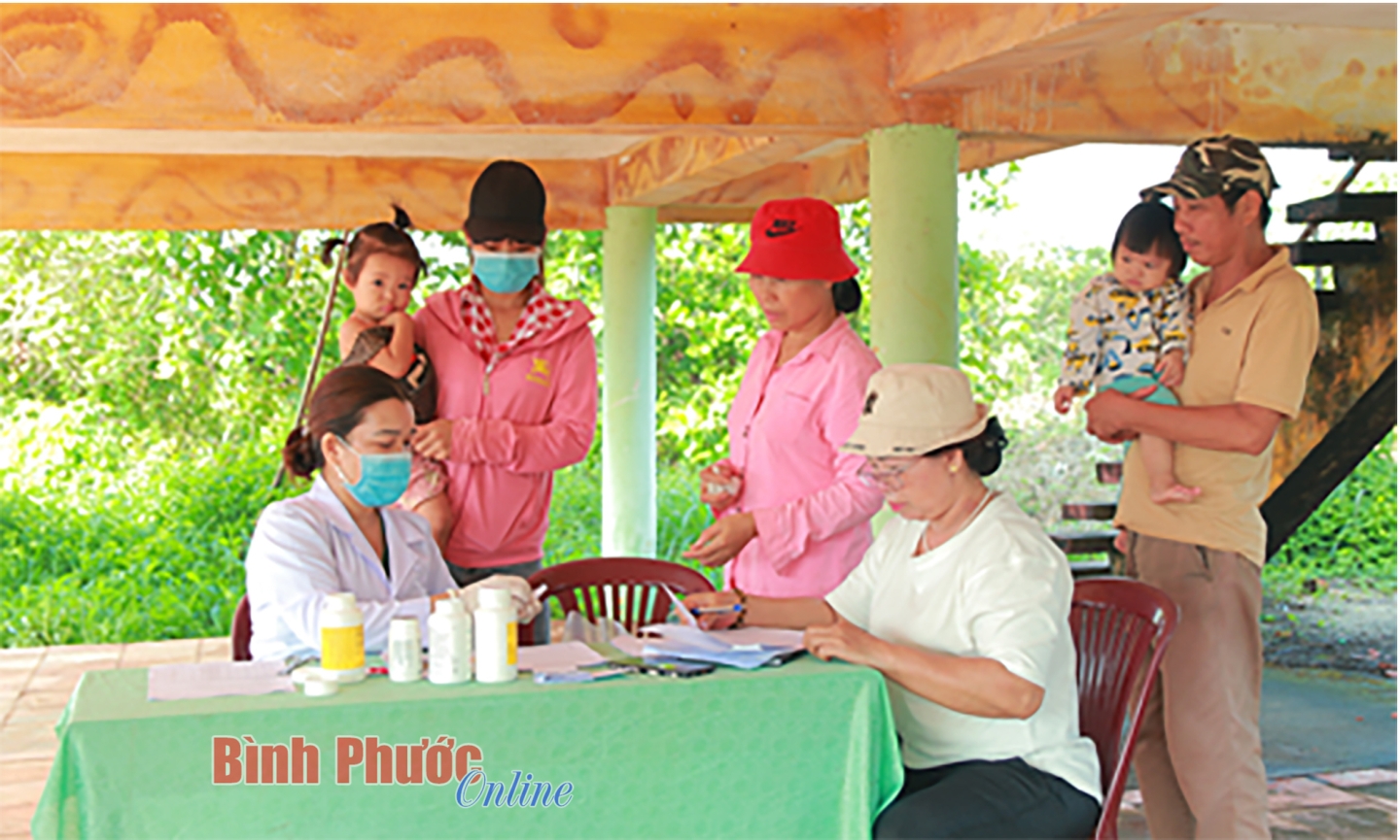 Người dân thôn 7, xã Long Bình, huyện Phú Riềng đưa trẻ đến điểm uống vitamin A và tẩy giun